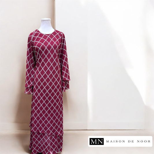 Chiffon Printed Ruffled Abaya Dress - Burgundy Plaid